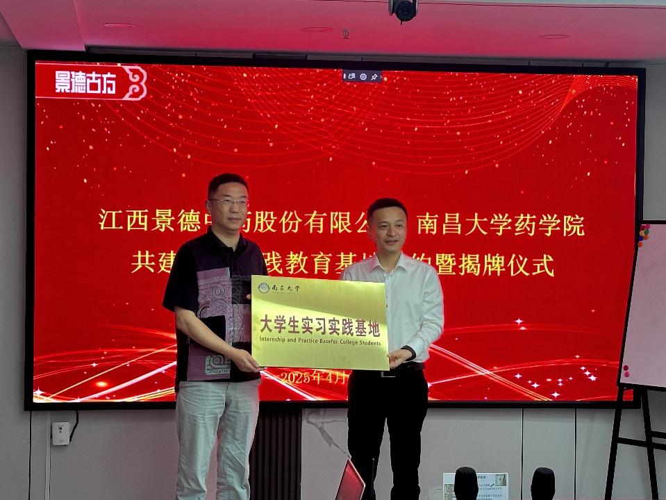 南昌大學藥學院與景德中藥簽訂了共建校外實踐教育基地的協(xié)議書,雙方將充分利用各自資源優(yōu)勢,共同推動產學研協(xié)同發(fā)展。會后,吳丹為景德中藥股份有限公司授予“大學生實習實踐基地”牌。