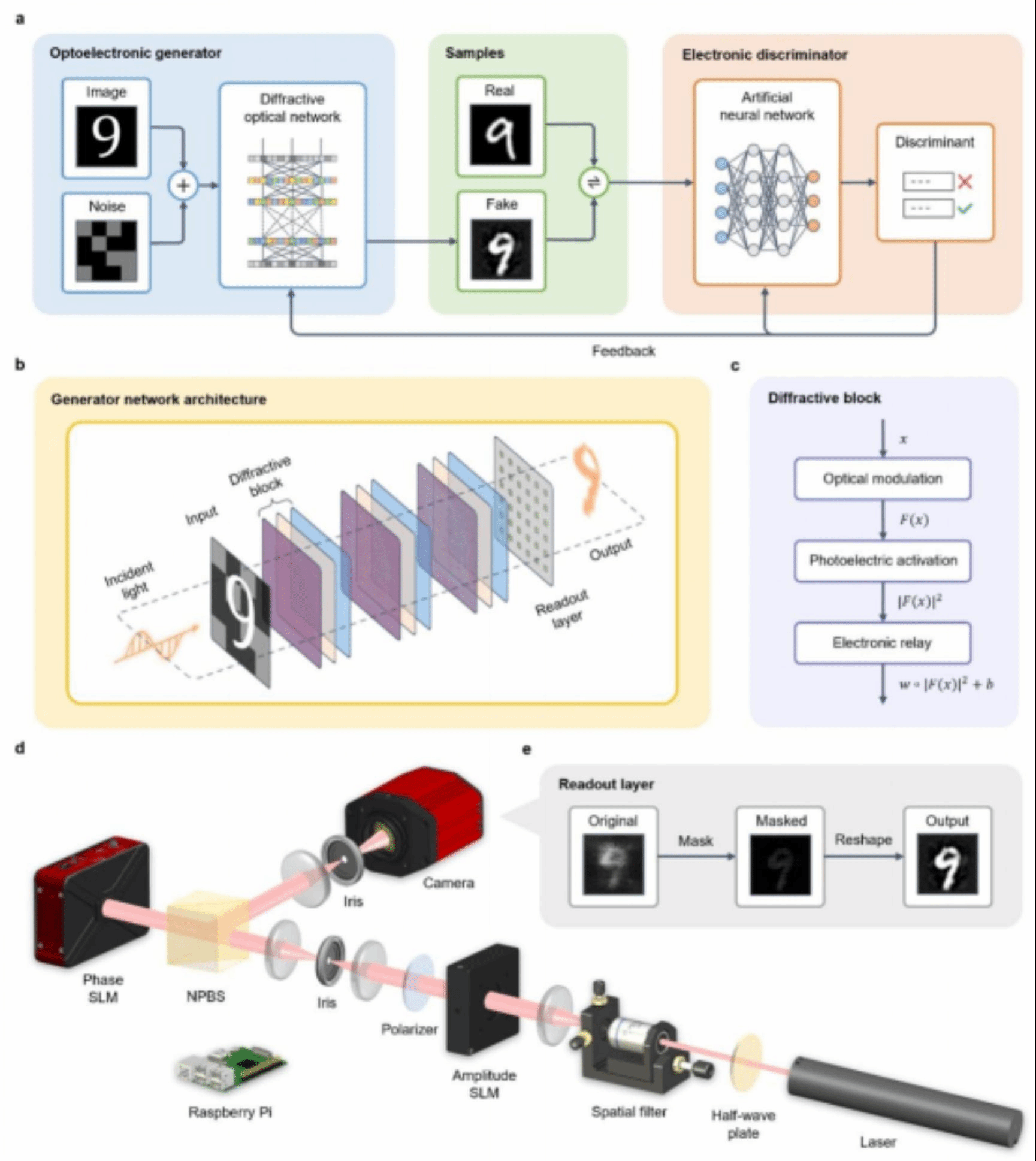 本網訊(物理與材料學院)近日,我校物理與材料學院于天寶教授帶領的微納光學團隊與信息工程學院劉婷婷副教授合作,將光計算與人工智能交叉結合,提出基于光電協同計算架構的生成模型——光電生成對抗網絡(OE-GAN),實現了復雜生成任務的高效處理,為突破生成式人工智能的算力與能效瓶頸提供了創新解決方案。該成果以“Optoelectronic generative adversarial networks”為題發表在Nature旗下期刊Communications Physics上。