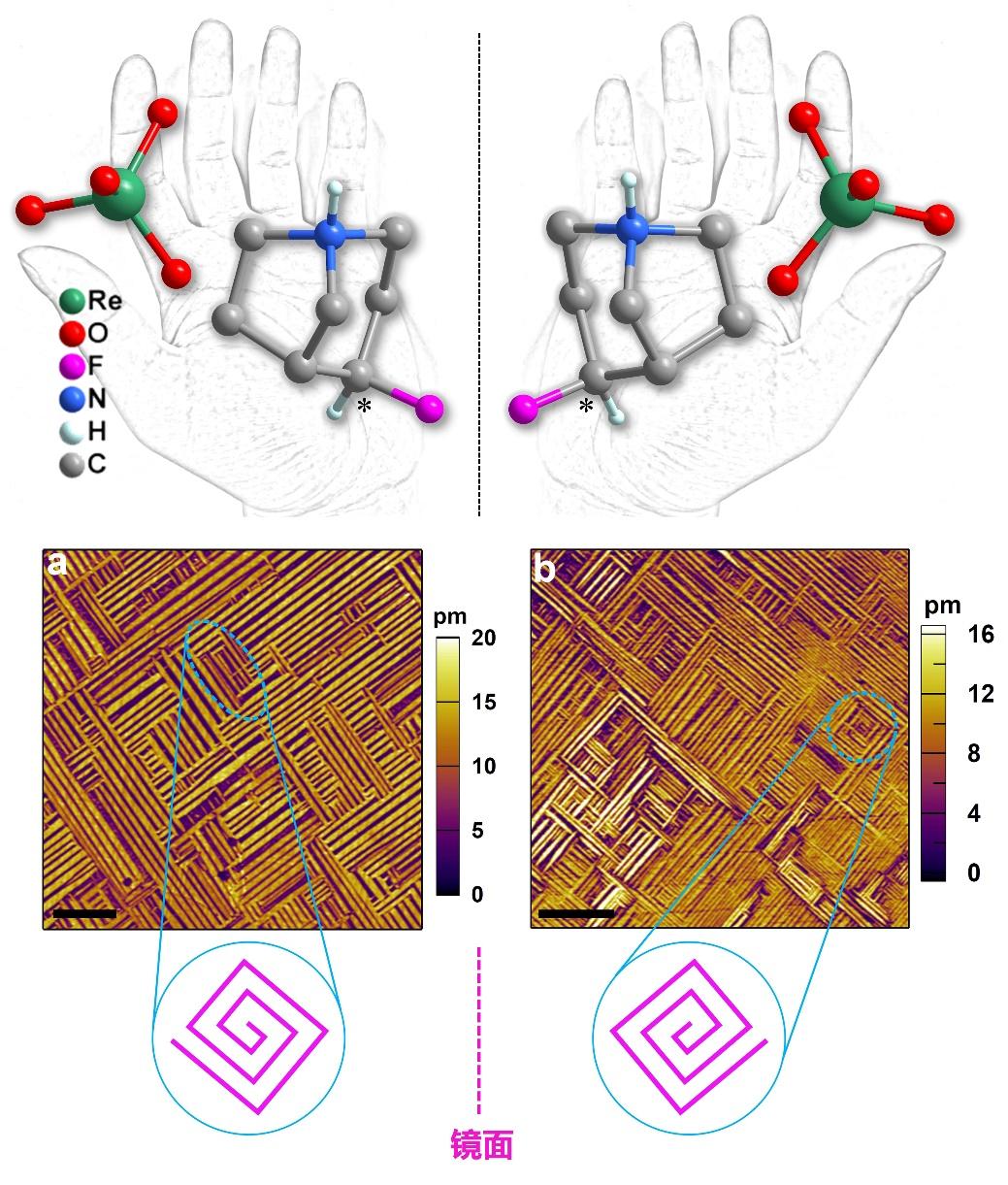 圖1.對映體鐵電體[RFAO][ReO4] (a)和[SFAO][ReO4] (b)薄膜中的本征手性疇結構。*為手性中心。