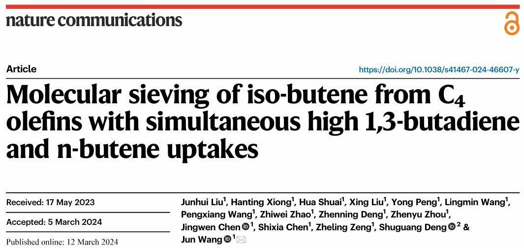 研究成果以“Molecular sieving of iso-butene from C4 olefins with simultaneous high 1,3-butadiene and n-butene uptakes”為題發表在Nature Communications上。論文的第一作者為南昌大學碩士研究生劉俊輝,王珺教授為唯一通訊作者,南昌大學為唯一通訊單位。這也是該論文課題組近兩年在Nature和Science子刊上發表的第五篇成果。