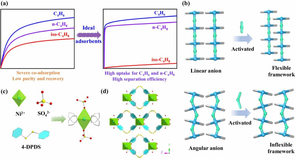 王珺教授團隊長期從事新型多孔材料設計與調控,圍繞石化工業的分離過程開展研究工作,近年來在高純氣體吸附分離制備、氣體污染物吸附脫除方面取得了較大的進展。近日,在前期研究工作的基礎上,王珺教授課題組利用非線性硫酸根柱撐,消除框架層間滑移,構筑了相對剛性的SOFOUR-DPDS-Ni吸附劑,利用其適宜的孔道環境,達到了對1,3-丁二烯和正丁烯的高吸附容量,同時抑制了大尺寸的異丁烯分子在孔道中的擴散和吸附,實現了異丁烯的篩分分離,可從二元和三元C4烯烴混合物中直接分離收集高純度異丁烯(99.9%)。