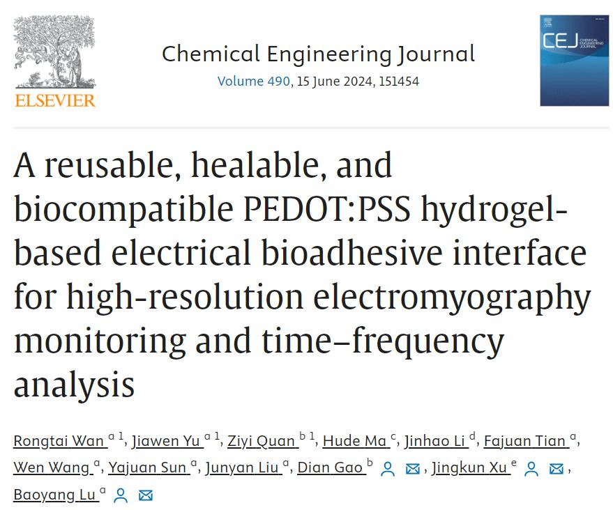 本網訊(基礎醫學院) 近日,基礎醫學院高典教授與江西科技師范大學盧寶陽教授等研究人員合作,在中科院一區TOP期刊(IF: 15.1)Chemical Engineering Journal發表題為“A reusable, healable, and biocompatible PEDOT:PSS hydrogel-based electrical bioadhesive interface for high-resolution electromyography monitoring and time–frequency analysis”的重要研究工作。該研究首次基于動態非共價相互作用原理設計并制備了基于PEDOT:PSS的高性能、可重復使用的肌電記錄貼片(EMP),為疾病的電生理信號監測提供了重要的便捷、低廉和高重復性選擇。
