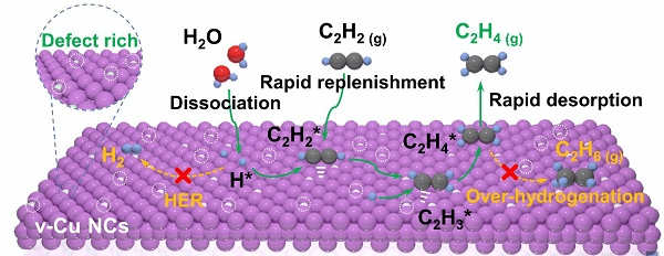 王珺教授團隊長期從事氣體吸附與催化轉化研究,近年來在高純氣體吸附分離制備、電化學炔烴加氫制烯烴方面取得了較好的進展。在前期研究工作的基礎上(Advanced Materials, 2024,36(41), 2408681),王珺教授課題組聯(lián)合UTS汪國秀教授課題組設計并制備了一種具有豐富氮缺陷和均勻暴露Cu (100)晶面的納米銅催化劑v-Cu NCs,首次在0.7 A cm-2電流密度下實現(xiàn)98.3%的乙烯法拉第效率,同時,在1.1 A cm-2的電流密度下,乙烯產(chǎn)率最高達17.69 mmol h-1 cm-2,這是目前已報道的最高值。該研究工作不僅實現(xiàn)了乙炔在工業(yè)級電流密度下乙烯的高選擇性生產(chǎn),還能純化工業(yè)粗乙烯生產(chǎn)聚合級乙烯原料,推動了電化學乙炔加氫制備乙烯的工業(yè)化進程。