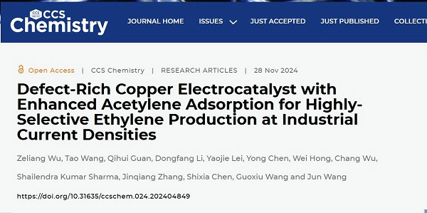 本網(wǎng)訊(化學化工學院 陳世霞 )近日,我校化學化工學院王珺教授課題組在電化學乙炔加氫制乙烯領域取得進展,研究成果以“Defect-Rich Copper Electrocatalyst with Enhanced Acetylene Adsorption for Highly-Selective Ethylene Production at Industrial Current Densities”為題發(fā)表在中國化學會旗艦期刊CCS Chemistry上。論文的第一作者為博士研究生吳澤亮和碩士研究生王濤,陳世霞副教授、王珺教授為通訊作者,南昌大學為第一通訊單位。該研究是南昌大學化工學科在電化學工程領域的標志性成果之一。