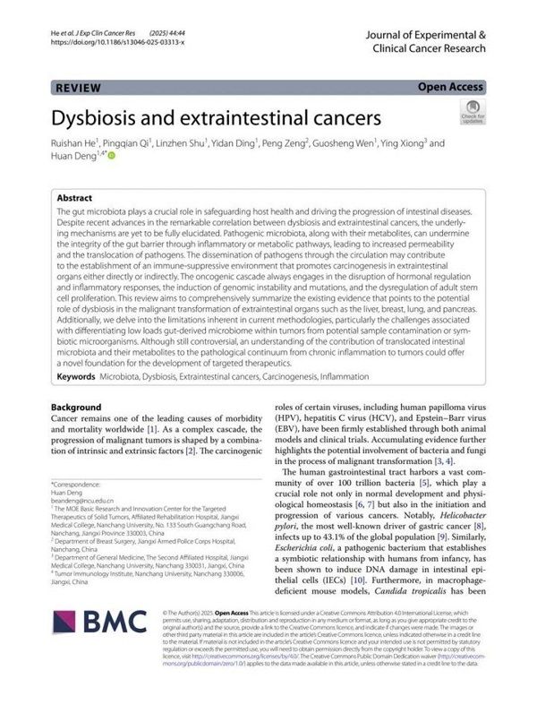 本網(wǎng)訊(第四附屬醫(yī)院)2月7日,我校第四附屬醫(yī)院副院長鄧歡團隊關于“菌群失調(diào)與腸外癌癥”的綜述,在線發(fā)表于國際腫瘤促進與研究協(xié)會(APSIT)會刊Journal of Experimental & Clinical Cancer Research(《實驗與臨床癌癥研究》,中科院一區(qū)TOP,IF:11.4)。“黨建+青苗計劃”學員賀睿珊為論文第一作者,教育部腫瘤醫(yī)藥基礎創(chuàng)新中心、南昌大學附屬康復醫(yī)院為第一通訊地址。