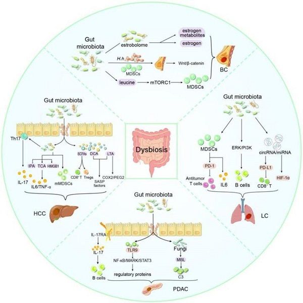 腸道菌群在維持人類健康方面發(fā)揮著至關重要的作用。近些年的研究表明,菌群失調(diào)涉及腸道外癌癥的發(fā)生和發(fā)展,但機制不明。綜述回顧了本課題組和其他研究人員近年來在該領域的研究成果、爭論的焦點問題以及未來的方向。致病微生物本身及其代謝產(chǎn)物可通過炎癥反應或代謝途徑破壞腸道屏障的完整性,導致病原體及代謝產(chǎn)物的播散。進入腸道外器官組織(乳腺、肝臟、胰腺和肺等)后,它們通過與免疫細胞、神經(jīng)和間質(zhì)細胞的相互作用重塑腫瘤微環(huán)境,促進實質(zhì)細胞的異常增殖和分化,最終導致腫瘤的發(fā)生和進展。但對于正常菌群的定義、低載量微生物的檢測和具體作用方式,學界仍存爭議,也是未來發(fā)展的重點方向。課題組借用“外圓內(nèi)方”的中國文化元素,系統(tǒng)描繪了病原體是如何透過腸道屏障,經(jīng)過循環(huán)系統(tǒng)傳播至遠隔器官,并通過多種途徑直接或間接地促進腸外器官的癌變(圖2)。