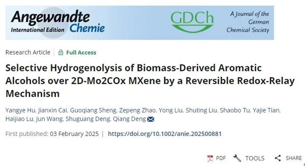 相關成果以“Selective Hydrogenolysis of Biomass-Derived Aromatic Alcohols over 2D-Mo2COx MXene by a Reversible Redox-Relay Mechanism”為題發表在Angew Chem. Int. Ed.上,我校碩士研究生胡仰業為論文的第一作者,鄧強副教授、涂少波副教授、劉勇教授為論文通訊作者。