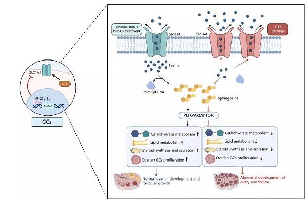 該團(tuán)隊(duì)首次報(bào)道,人尿液來(lái)源的干細(xì)胞對(duì)環(huán)磷酰胺誘發(fā)卵巢早衰具有顯著防治效果。進(jìn)一步的研究發(fā)現(xiàn),人尿源性干細(xì)胞主要是通過(guò)旁分泌外泌體而發(fā)揮其治療作用。他們的研究揭示,外泌體中的miRNA-27b-3p可以特異性地與卵巢內(nèi)重要靶細(xì)胞卵巢顆粒細(xì)胞的SLC1A4基因的3’-UTR區(qū)域結(jié)合,抑制環(huán)磷酰胺引起的SLC1A4表達(dá)升高,維持卵巢顆粒細(xì)胞內(nèi)絲氨酸的平衡,從而激活PI3K/Akt/mTOR信號(hào)通路,減少環(huán)磷酰胺引起的卵巢早衰現(xiàn)象。基于這些發(fā)現(xiàn),該團(tuán)隊(duì)闡明了SLC1A4及絲氨酸平衡參與的卵巢早衰的全新分子機(jī)制。