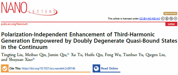 本網(wǎng)訊(信息工程學院)近日,我校信息工程學院成像與視覺表示研究團隊在非線性光學領(lǐng)域取得重要研究進展。團隊提出基于雙重簡并準連續(xù)域束縛態(tài)(Quasi-Bound States in the Continuum, Quasi-BICs)的硅基超表面設(shè)計,實現(xiàn)了偏振無關(guān)的三次諧波(Third-Harmonic Generation, THG)高效增強。相關(guān)成果以“Polarization-Independent Enhancement of Third-Harmonic Generation Empowered by Doubly Degenerate Quasi-Bound States in the Continuum”為題,發(fā)表于光學與納米科技交叉領(lǐng)域國際期刊Nano Letters。