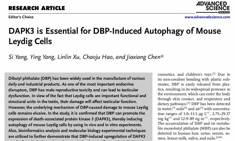本網訊(基礎醫(yī)學院)近日,基礎醫(yī)學院陳加祥教授團隊在Advanced Science(IF="14.3)期刊上發(fā)表了題為DAPK3 is essential for DBP-induced autophagy of mouse Leydig cells的研究論文,論文第一作者為博士后楊思博士,南昌大學基礎醫(yī)學院為第一通訊單位。該論文被選為編輯精選(Editor's Choice)論文。該論文提示了睪丸Leydig細胞是DBP作用的潛在靶標,且DAPK3很可能可作為診斷、治療及預防DBP導致的男性生殖損傷的靶基因。