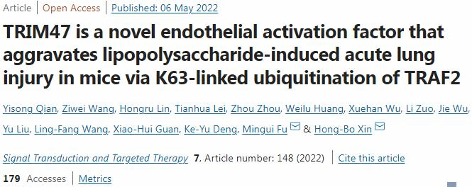 本網(wǎng)訊(轉(zhuǎn)化醫(yī)學(xué)研究院)內(nèi)皮活化在膿毒癥引起的急性肺損傷的發(fā)病機制中起重要作用,然而,詳細的調(diào)節(jié)機制目前仍不清楚。5月6日,南昌大學(xué)轉(zhuǎn)化醫(yī)學(xué)研究院為第一單位,美國密蘇里大學(xué)醫(yī)學(xué)院為合作單位,在Nature出版集團的Signal Transduction and Targeted Therapy (IF=""""18.187,醫(yī)學(xué)TOP期刊)雜志在線發(fā)表題為“TRIM47""" is a novel endothelial activation factor that aggravates lipopolysaccharide-induced acute lung injury in mice via K63-linked ubiquitination of TRAF2”的研究論文。南昌大學(xué)轉(zhuǎn)化醫(yī)學(xué)研究院辛洪波教授及密蘇里大學(xué)醫(yī)學(xué)院符民桂教授為共同通訊作者,南昌大學(xué)轉(zhuǎn)化醫(yī)學(xué)研究院錢貽崧副研究員為第一作者。