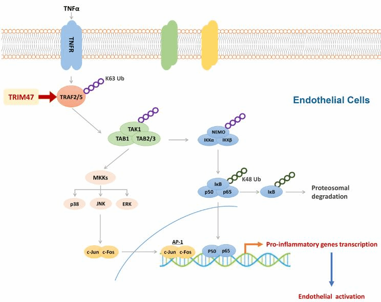 該研究報道了E3泛素連接酶TRIM家族蛋白成員——TRIM47在血管內(nèi)皮細胞中特異性表達,是一個新的內(nèi)皮活化誘導(dǎo)因子。TRIM47 基因敲除小鼠通過減輕肺部炎癥有效抵抗脂多糖(LPS)誘導(dǎo)的急性肺損傷和死亡。在體外 TNFα誘導(dǎo)的內(nèi)皮活化模型中,TRIM47表達上調(diào);而在內(nèi)皮細胞中敲低TRIM47可抑制多種促炎細胞因子的轉(zhuǎn)錄,減少單核細胞粘附和粘附分子的表達,并抑制內(nèi)皮細胞中促炎細胞因子的分泌。此外,該研究發(fā)現(xiàn)TRIM47通過促進 TNFα信號通路的關(guān)鍵成分TRAF2的泛素化,激活NF-κB和MAPK促炎信號通路,導(dǎo)致內(nèi)皮活化,進而觸發(fā)肺部炎癥和加重急性肺損傷進程。