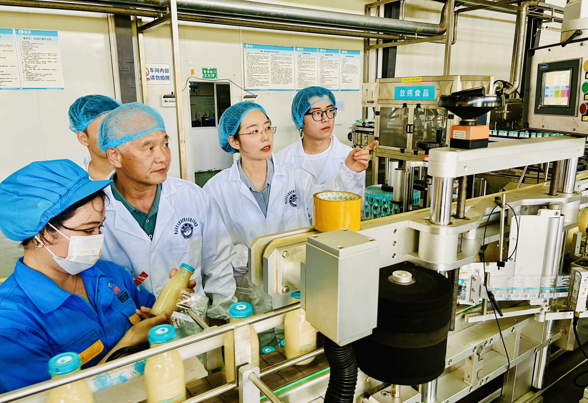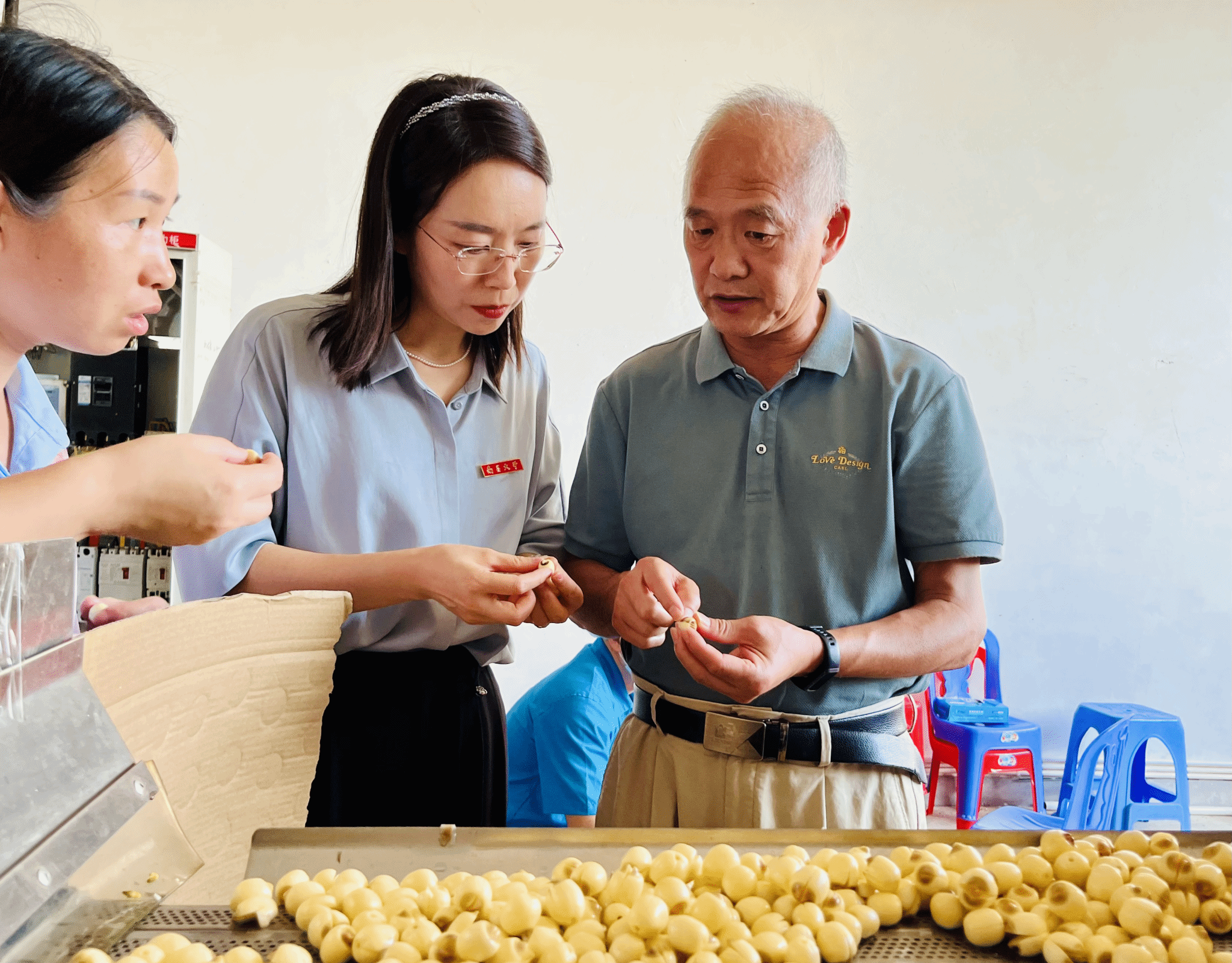 妥善存放酸奶后,一行人走進了蓮子加工車間,生產車間內一臺臺先進食品生產設備正高速運轉,蓮子清香撲鼻而來。鄧澤元等輕車熟路,看完生產線情況后,立馬轉向查看并指導了該公司新解鎖的低溫急凍嫩鮮蓮子的生產技術。