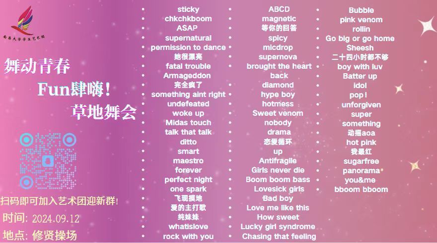 南昌大學(xué)學(xué)生藝術(shù)團以舞為媒,誠邀朋友們共赴“舞動青春,Fun肆嗨!”草坪之約。音樂隨機播放,舞步由你定義!無論你是舞蹈高手,還是初學(xué)者,這里都有你的舞臺,藝術(shù)團的同學(xué)將帶領(lǐng)你,與舞者們同臺競技,享受這份青春的熱烈與自由!帶上你的熱情和期待,9月12日晚19:00,修賢操場,等你來嗨!