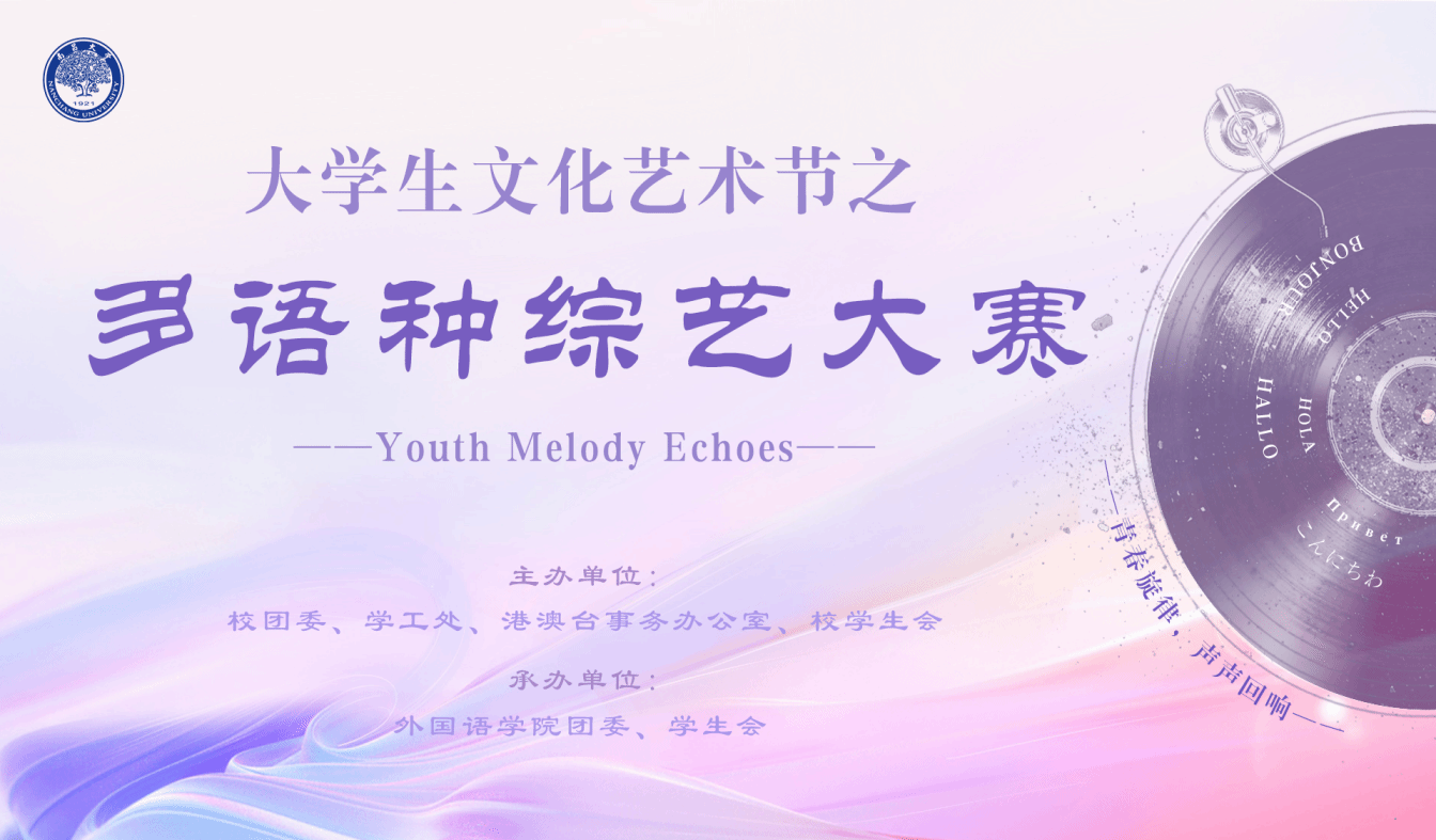 為深入學習習近平文化思想,加強校園文化建設,營造青春向上的積極氛圍,特此舉辦南昌大學2024年大學生文化藝術節之Youth Melody Echoes”多語種綜藝大賽。