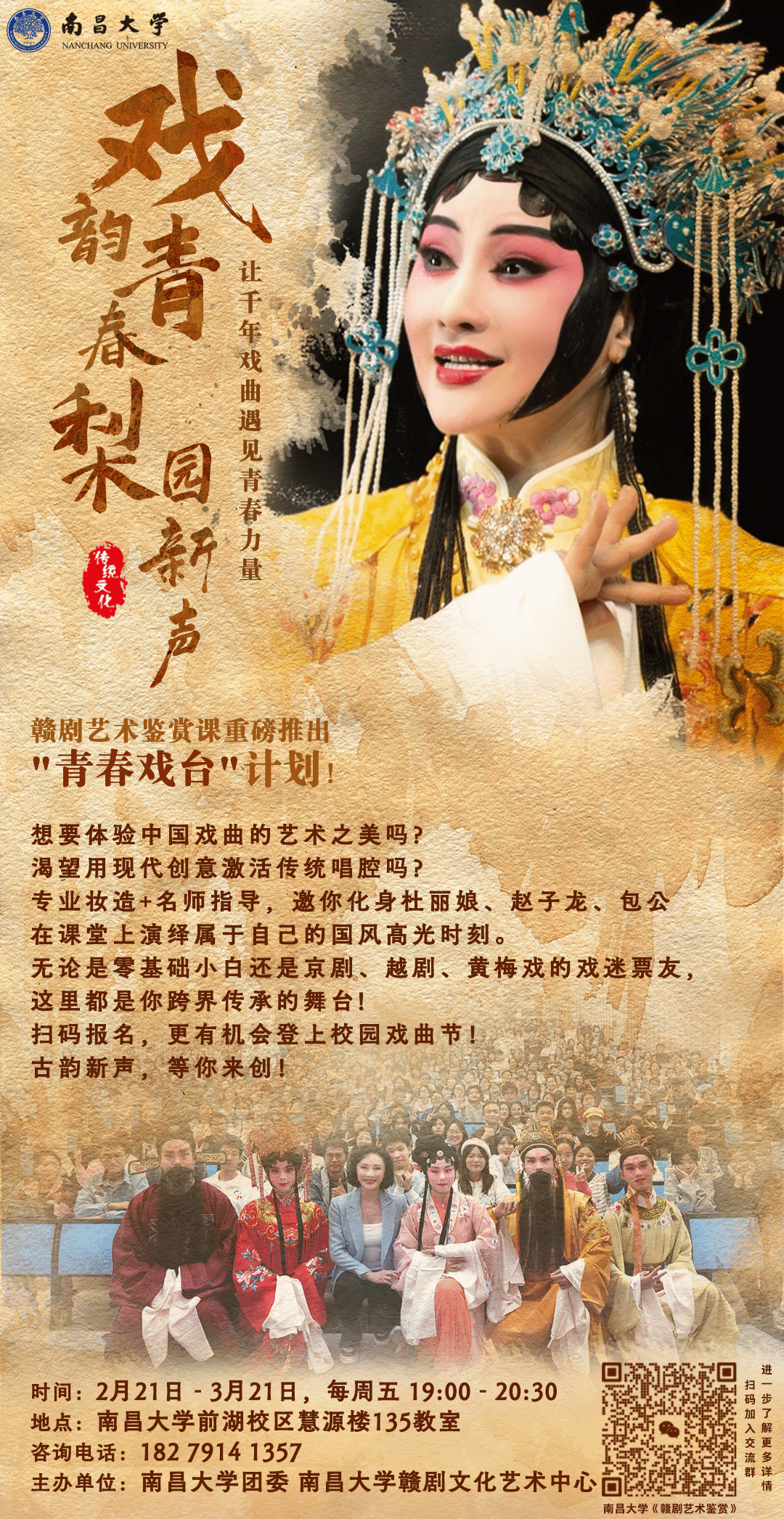 讓廣大師生體驗中國戲曲的藝術之美,用現代創意激活傳統唱腔,特舉辦【戲韻青春·梨園新聲】贛劇藝術鑒賞課,并重磅推出“青春戲臺”計劃,提供專業妝造、名師指導,邀你化身杜麗娘、趙子龍、包公在課堂上演繹屬于自己的國風高光時刻。