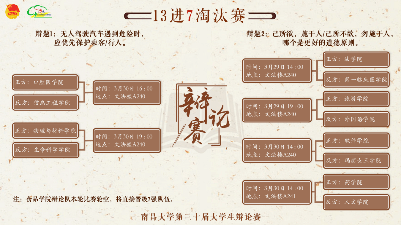 經過院賽、校級初賽的激烈角逐,最終有13支學院辯論隊成功晉級,他們分別是:法學院、藥學院、食品學院、旅游學院、人文學院、軟件學院、外國語學院、口腔醫學院、生命科學學院、信息工程學院、瑪麗女王學院、第一臨床醫學院以及物理與材料學院辯論隊伍。“137”淘汰賽即將拉開帷幕,讓我們共同期待辯手們的精彩表現!